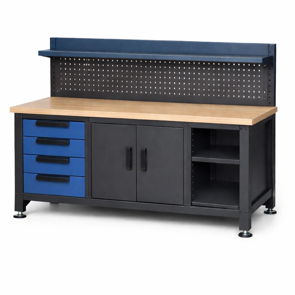 Werkbank Holzplatte Metall Schubladen Schränke Blau Schwarz
