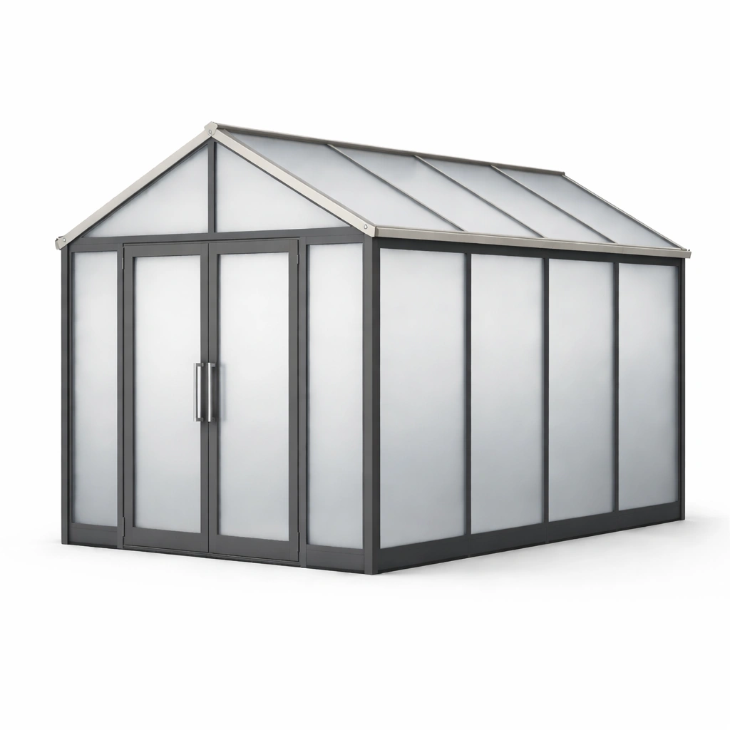Das Gewächshaus besteht aus einem stabilen Aluminiumrahmen und 6 mm dicken UV-beständigen Polycarbonatplatten, die lichtdurchlässig sind. Die Doppelschiebetür sorgt für einfache Zugänglichkeit und verbesserte Belüftung. Das Haus ist wasserdicht und eignet sich für gemäßigtes Klima.