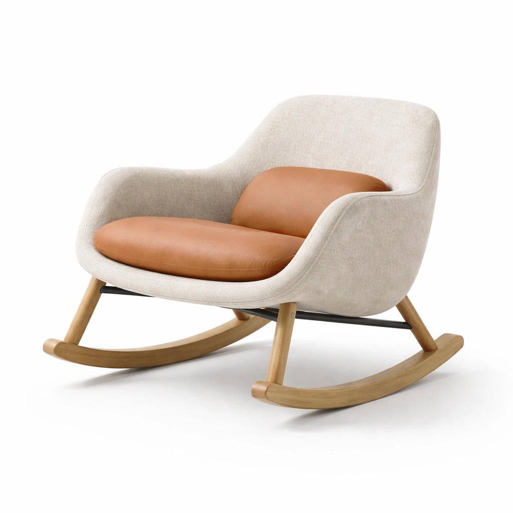 Der Schaukelstuhl besteht aus einem stabilen Holzrahmen. Der Sitzbereich ist mit PU-Leder gepolstert, während der übrige Teil mit einem robusten Textil bezogen ist.
