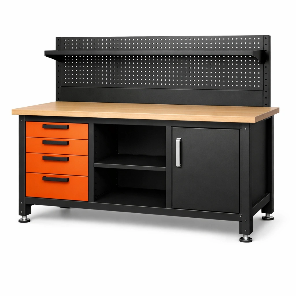 Die Werkbank wiegt 52 kg und bietet eine vielseitige Arbeitsfläche mit integriertem Stauraum. Sie umfasst 4 Schubladen, einen Schrank, ein Regal und eine Lochwand.